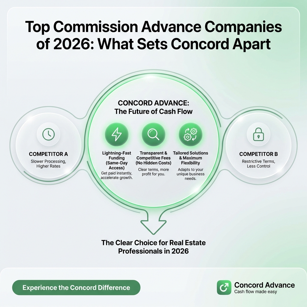 Whether you’re a seasoned top producer or an ambitious newcomer, the choice of commission advance provider is a pivotal one. As 2026 unfolds, more agents are finding that when it comes to transparency, service, and speed, Concord Advance is not only keeping pace it’s setting the standard.